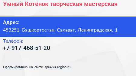 Умный Котёнок, творческая мастерская по адресу 453251, Башкортостан, Салават, Ленинградская, 1 в дальнейшем Организация, размещена в следующих категориях: