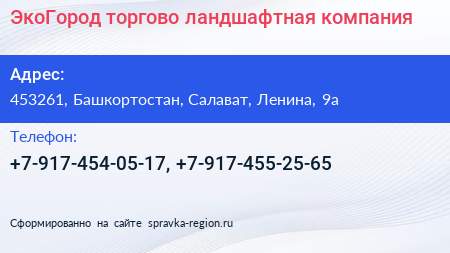 ЭкоГород, торгово-ландшафтная компания по адресу 453261, Башкортостан, Салават, Ленина, 9а в дальнейшем Организация, размещена в следующих категориях: