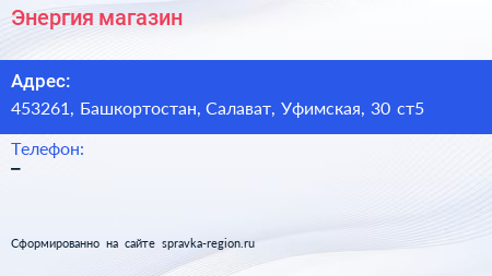 Энергия, магазин по адресу 453261, Башкортостан, Салават, Уфимская, 30 ст5 в дальнейшем Организация, размещена в следующих категориях: