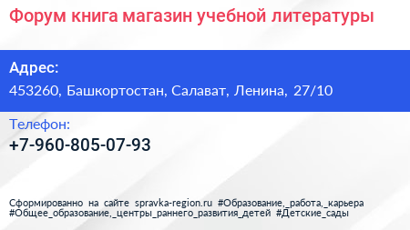 Форум-книга, магазин учебной литературы по адресу 453260, Башкортостан, Салават, Ленина, 27/10 в дальнейшем Организация, размещена в следующих категориях:
