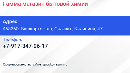 Гамма, магазин бытовой химии по адресу 453260, Башкортостан, Салават, Калинина, 47 в дальнейшем Организация, размещена в следующих категориях: