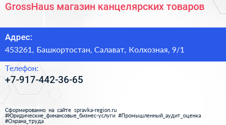 GrossHaus, магазин канцелярских товаров по адресу 453261, Башкортостан, Салават, Колхозная, 9/1 в дальнейшем Организация, размещена в следующих категориях: