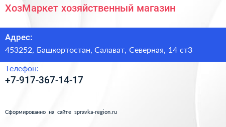 ХозМаркет, хозяйственный магазин по адресу 453252, Башкортостан, Салават, Северная, 14 ст3 в дальнейшем Организация, размещена в следующих категориях: