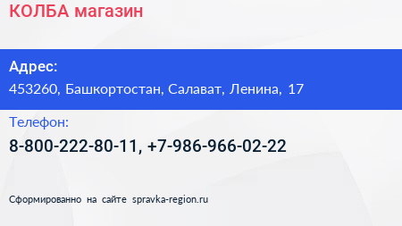 КОЛБА, магазин по адресу 453260, Башкортостан, Салават, Ленина, 17 в дальнейшем Организация, размещена в следующих категориях:
