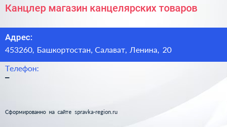 Канцлер, магазин канцелярских товаров по адресу 453260, Башкортостан, Салават, Ленина, 20 в дальнейшем Организация, размещена в следующих категориях: