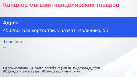 Канцлер, магазин канцелярских товаров по адресу 453260, Башкортостан, Салават, Калинина, 55 в дальнейшем Организация, размещена в следующих категориях: