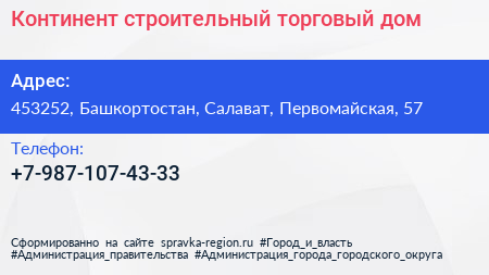 Континент, строительный торговый дом по адресу 453252, Башкортостан, Салават, Первомайская, 57 в дальнейшем Организация, размещена в следующих категориях: