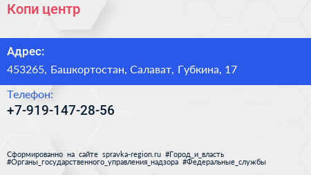 Копи-центр по адресу 453265, Башкортостан, Салават, Губкина, 17 в дальнейшем Организация, размещена в следующих категориях: