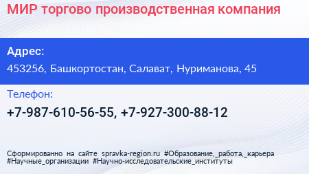 МИР, торгово-производственная компания по адресу 453256, Башкортостан, Салават, Нуриманова, 45 в дальнейшем Организация, размещена в следующих категориях:
