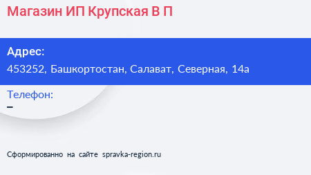 Магазин, ИП Крупская В.П. по адресу 453252, Башкортостан, Салават, Северная, 14а в дальнейшем Организация, размещена в следующих категориях: