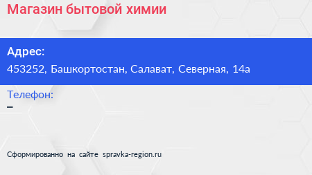 Магазин бытовой химии по адресу 453252, Башкортостан, Салават, Северная, 14а в дальнейшем Организация, размещена в следующих категориях: