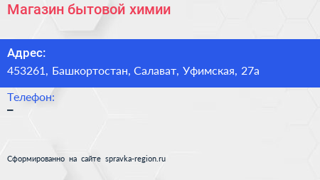 Магазин бытовой химии по адресу 453261, Башкортостан, Салават, Уфимская, 27а в дальнейшем Организация, размещена в следующих категориях: