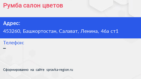 Румба, салон цветов по адресу 453260, Башкортостан, Салават, Ленина, 46а ст1 в дальнейшем Организация, размещена в следующих категориях: