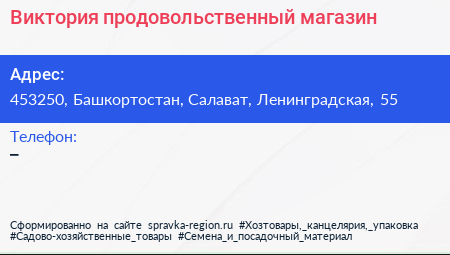 Виктория, продовольственный магазин по адресу 453250, Башкортостан, Салават, Ленинградская, 55 в дальнейшем Организация, размещена в следующих категориях: