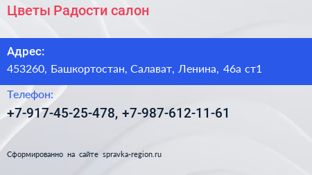 Цветы Радости, салон по адресу 453260, Башкортостан, Салават, Ленина, 46а ст1 в дальнейшем Организация, размещена в следующих категориях: