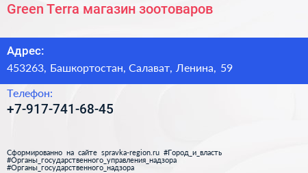 Green Terra, магазин зоотоваров по адресу 453263, Башкортостан, Салават, Ленина, 59 в дальнейшем Организация, размещена в следующих категориях: