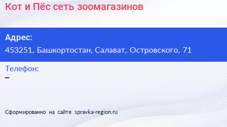 Кот и Пёс, сеть зоомагазинов по адресу 453251, Башкортостан, Салават, Островского, 71 в дальнейшем Организация, размещена в следующих категориях: