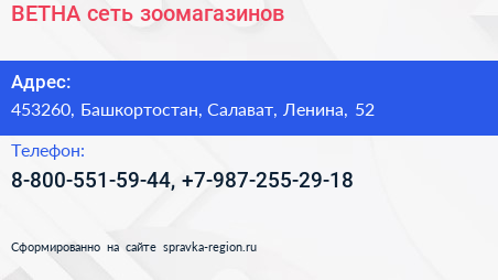 ВЕТНА, сеть зоомагазинов по адресу 453260, Башкортостан, Салават, Ленина, 52 в дальнейшем Организация, размещена в следующих категориях: