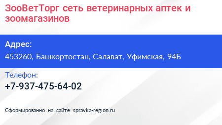 ЗооВетТорг, сеть ветеринарных аптек и зоомагазинов по адресу 453260, Башкортостан, Салават, Уфимская, 94Б в дальнейшем Организация, размещена в следующих категориях: