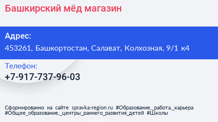 Башкирский мёд, магазин по адресу 453261, Башкортостан, Салават, Колхозная, 9/1 к4 в дальнейшем Организация, размещена в следующих категориях: