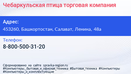 Чебаркульская птица, торговая компания по адресу 453260, Башкортостан, Салават, Ленина, 48а в дальнейшем Организация, размещена в следующих категориях: