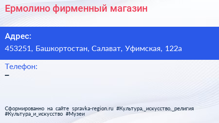 Ермолино, фирменный магазин по адресу 453251, Башкортостан, Салават, Уфимская, 122а в дальнейшем Организация, размещена в следующих категориях: