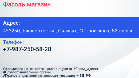 Фасоль, магазин по адресу 453250, Башкортостан, Салават, Островского, 82 киоск в дальнейшем Организация, размещена в следующих категориях: