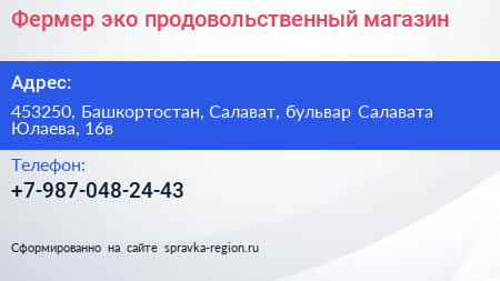 Фермер эко, продовольственный магазин по адресу 453250, Башкортостан, Салават, бульвар Салавата Юлаева, 16в в дальнейшем Организация, размещена в следующих категориях: