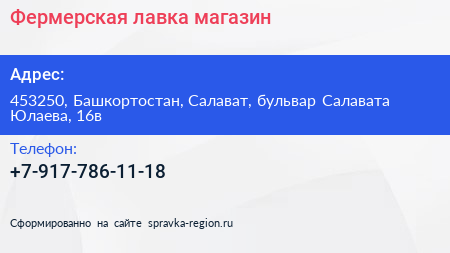 Фермерская лавка, магазин по адресу 453250, Башкортостан, Салават, бульвар Салавата Юлаева, 16в в дальнейшем Организация, размещена в следующих категориях:
