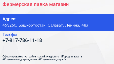 Фермерская лавка, магазин по адресу 453260, Башкортостан, Салават, Ленина, 48а в дальнейшем Организация, размещена в следующих категориях: