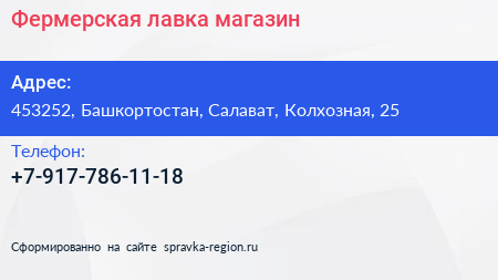 Фермерская лавка, магазин по адресу 453252, Башкортостан, Салават, Колхозная, 25 в дальнейшем Организация, размещена в следующих категориях: