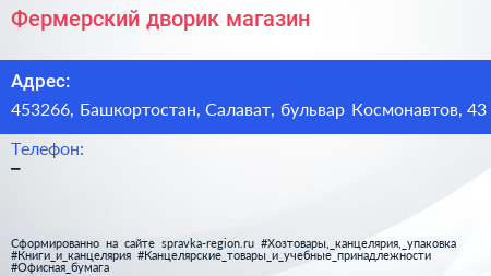 Фермерский дворик, магазин по адресу 453266, Башкортостан, Салават, бульвар Космонавтов, 43 в дальнейшем Организация, размещена в следующих категориях: