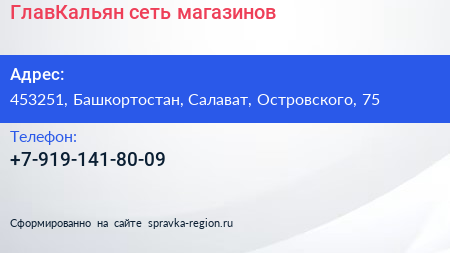 ГлавКальян, сеть магазинов по адресу 453251, Башкортостан, Салават, Островского, 75 в дальнейшем Организация, размещена в следующих категориях: