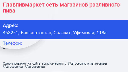 Главпивмаркет, сеть магазинов разливного пива по адресу 453251, Башкортостан, Салават, Уфимская, 118а в дальнейшем Организация, размещена в следующих категориях: