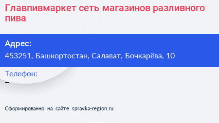 Главпивмаркет, сеть магазинов разливного пива по адресу 453251, Башкортостан, Салават, Бочкарёва, 10 в дальнейшем Организация, размещена в следующих категориях: