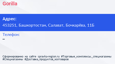 Gorilla по адресу 453251, Башкортостан, Салават, Бочкарёва, 11Б в дальнейшем Организация, размещена в следующих категориях:
