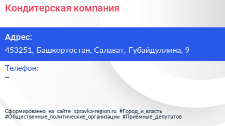 Кондитерская компания по адресу 453251, Башкортостан, Салават, Губайдуллина, 9 в дальнейшем Организация, размещена в следующих категориях: