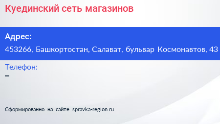 Куединский, сеть магазинов по адресу 453266, Башкортостан, Салават, бульвар Космонавтов, 43 в дальнейшем Организация, размещена в следующих категориях:
