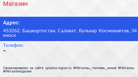Магазин по адресу 453262, Башкортостан, Салават, бульвар Космонавтов, 34 киоск в дальнейшем Организация, размещена в следующих категориях: