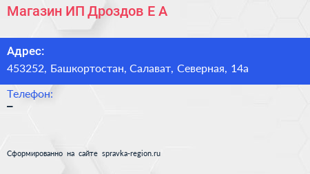 Магазин, ИП Дроздов Е.А. по адресу 453252, Башкортостан, Салават, Северная, 14а в дальнейшем Организация, размещена в следующих категориях: