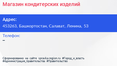 Магазин кондитерских изделий по адресу 453263, Башкортостан, Салават, Ленина, 53 в дальнейшем Организация, размещена в следующих категориях: