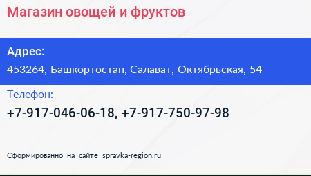 Магазин овощей и фруктов по адресу 453264, Башкортостан, Салават, Октябрьская, 54 в дальнейшем Организация, размещена в следующих категориях: