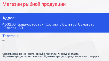 Магазин рыбной продукции по адресу 453250, Башкортостан, Салават, бульвар Салавата Юлаева, 30 в дальнейшем Организация, размещена в следующих категориях: