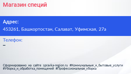 Магазин специй по адресу 453261, Башкортостан, Салават, Уфимская, 27а в дальнейшем Организация, размещена в следующих категориях: