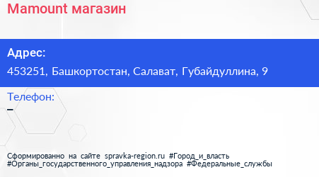 Mamount, магазин по адресу 453251, Башкортостан, Салават, Губайдуллина, 9 в дальнейшем Организация, размещена в следующих категориях: