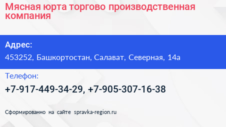 Мясная юрта, торгово-производственная компания по адресу 453252, Башкортостан, Салават, Северная, 14а в дальнейшем Организация, размещена в следующих категориях: