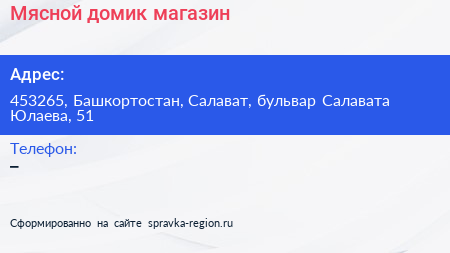Мясной домик, магазин по адресу 453265, Башкортостан, Салават, бульвар Салавата Юлаева, 51 в дальнейшем Организация, размещена в следующих категориях:
