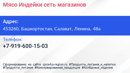 Мясо Индейки, сеть магазинов по адресу 453260, Башкортостан, Салават, Ленина, 48а в дальнейшем Организация, размещена в следующих категориях: