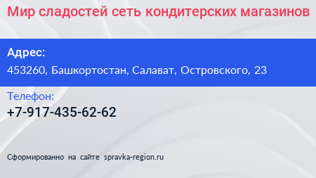 Мир сладостей, сеть кондитерских магазинов по адресу 453260, Башкортостан, Салават, Островского, 23 в дальнейшем Организация, размещена в следующих категориях: