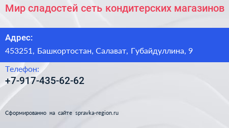 Мир сладостей, сеть кондитерских магазинов по адресу 453251, Башкортостан, Салават, Губайдуллина, 9 в дальнейшем Организация, размещена в следующих категориях: